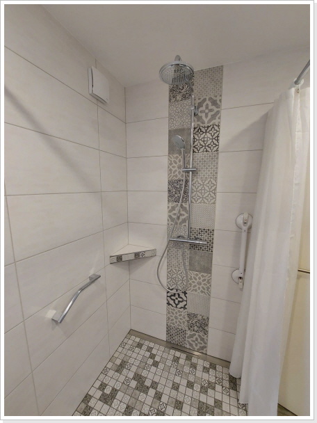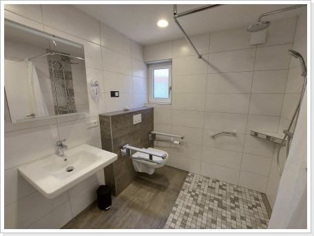 Das geräumige Bad ist mit einer rollstuhlgerechten Dusche ausgestattet. In einem Schafzimmer steht ein verstellbares Funktionsbett zur Verfügung