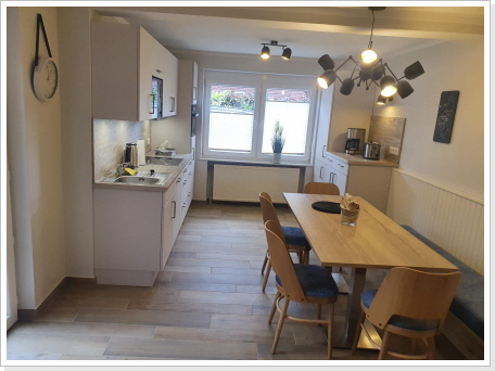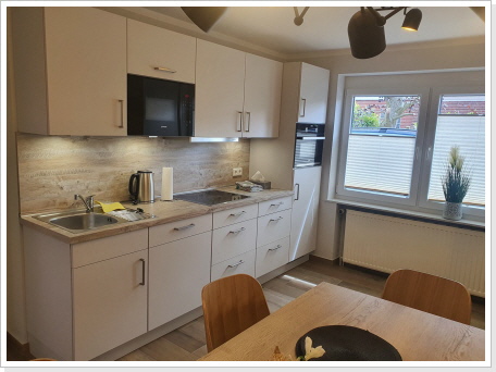 Die schöne im Erdgeschoss liegende Ferienwohnung verfügt über eine große Küche mit Essplatz gut eingerichteter Einbauküche.